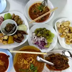 Follow Bomiko. Today, I will take you to eat northern food. Today, I will take you to Huen Phen restaurant. It is the most famous local restaurant in Chiang Mai. This restaurant is very old and has been open for over 40 years. Huen Phen restaurant is well-known and popular among locals and tourists, both Thai and foreign, because it has delicious food and is not expensive. The price of food is around 50-80 baht per dish. And if you come to visit Chiang Mai, you can't miss eating authentic local food such as Sai Ua, Khao Niew - Som Tam, Khao Soi, Nam Prik Num, etc. It is considered the best of deliciousness. And it is very easy to get to the restaurant because it is near the Wat Phra Singh Police Station in the moat of Chiang Mai. After praying, you can stop by to eat at the restaurant.