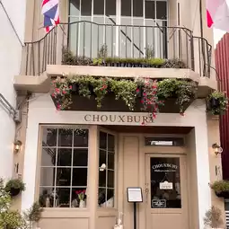 The building is in kimono color. There are flowers in front of the shop to call each other