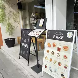 Single Origin Store, a coffee shop with very good coffee and a great location, right at Thapae Gate. You can see the city gate and the red cars, the symbol of Chiang Mai, running through and lined up on the side of the road.
