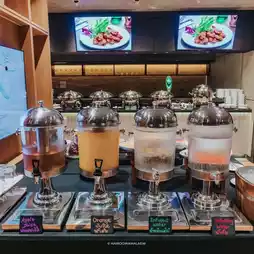 🥙 Breakfast is full of Thai food, fried eggs, ham, sausage, fruit, salad, drinks and bread.