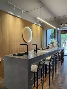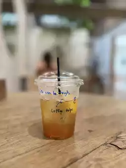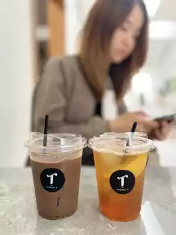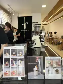 Transit Number 8 is divided into 2 sides, connected by a zebra crossing, a very cool popular corner where people like to take pictures. In front of the shop, there is a zone that simulates a bus stop decorated with chairs and a vending machine. The interior still maintains the original concept of a resting point. It stands out with stairs designed to look like airport escalators and a counter bar designed to look like a luggage conveyor belt. The shop is decorated in white tones and emphasizes the use of wooden furniture that gives a warm and relaxing feeling. It takes advantage of natural light to make the shop look spacious and airy, and also creates beautiful light and shadows that are perfect for taking pictures. There are also many seating areas to choose from.