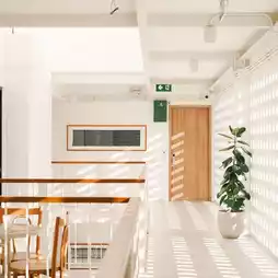 The warmth of the décor is evident throughout, with wooden furniture in each room. There's a common area for sitting and a corner with trees, where the greenery perfectly contrasts with the walls.