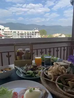 Breakfast has a choice of Northern Thai food Khantoke sets or American breakfasts. There is also a buffet of salads and cereals that we like. Most importantly, the view from the dining room in the morning can see Doi Suthep.