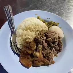 Pig Feet Rice Bowl, Khao Ka Mu, sold by a female owner wearing a cowboy hat.