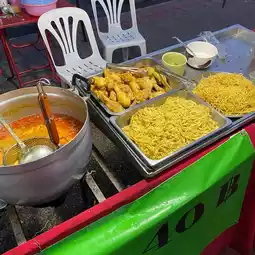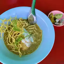 Khao Soi is a curry-flavored chicken noodle dish that is only found in the northern region. The Khao Soi from this street vendor is really delicious, so I often eat it. It is not a clear broth, but it is a bit soupy, but it is full and delicious because it contains noodles and a whole chicken leg!