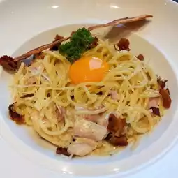 This dish is well done, the sauce is rich, fragrant, creamy, with a soft egg yolk and generously sprinkled with grated Parmesan cheese. The bacon is both soft and crispy, giving a nice contrasting texture. Delicious.