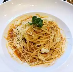 The spaghetti is boiled to the right level of chewiness, but the Bolognese sauce is not very rich.