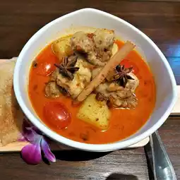 The curry paste is fragrant and tasty, but the curry is not very thick. The fried roti dough is a bit oily.