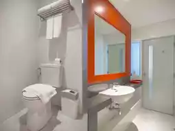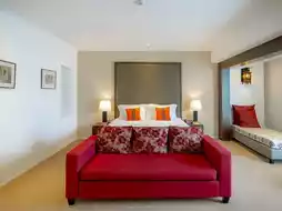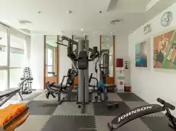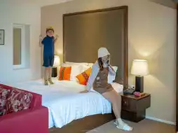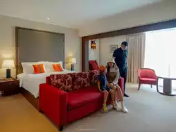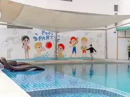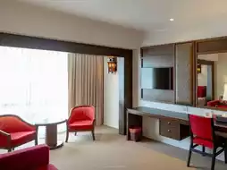 The room is very spacious, with a soft bed, a large TV, and a bathroom with separate dry and wet zones. Other facilities include a swimming pool, spa, and fitness center.