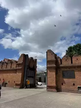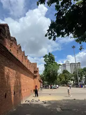 🏡 In the past, this was a city wall. It was built from orange-red bricks and surrounded the moat. Now, they have preserved it for tourists to visit and take pictures. The signature is taking pictures of the pigeons.