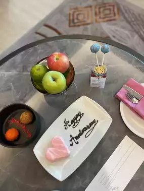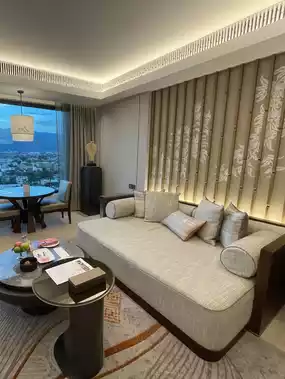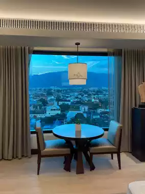For the room, I stayed in a suite room. The room was spacious and well-proportioned. There were lovely welcome snacks and fruits. It was decorated in warm tones. You can see both Doi Suthep and Chiang Mai city directly from the room. I really like it. Plus, this room has a bathtub with a city view.