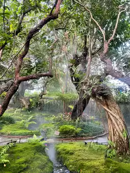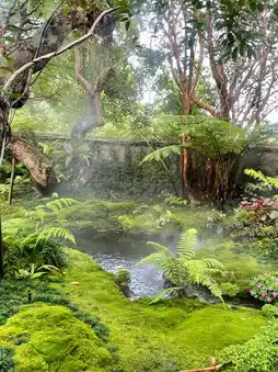 The mist sprayed in the garden creates a mysterious atmosphere.