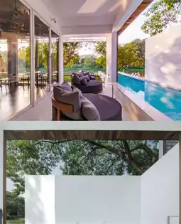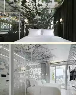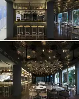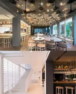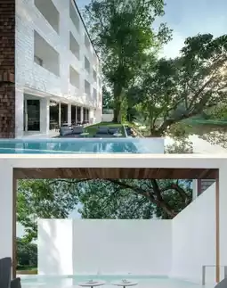 The first floor is a public area including a restaurant and bar, with an overall contrasting black color, creating a completely different atmosphere~ The infinity pool is nestled among the shadows of the trees, dreamlike and fantastic.