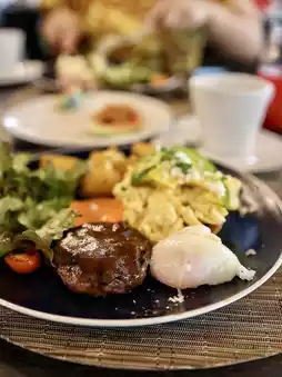 Breakfast is semi-buffet style, starting the new day with a serving of avocado fried eggs paired with small beef patties.