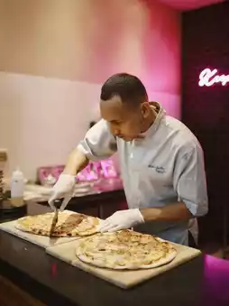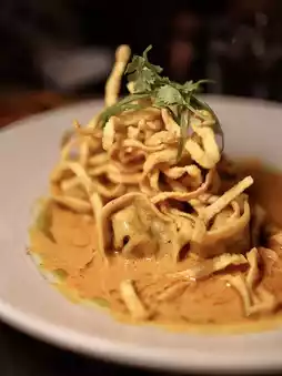 I highly recommend the hotel's Italian restaurant. The authentic Italian thin-crust pizza is baked in a wood-fired oven at high temperatures of four to five hundred degrees, which quickly caramelizes the crust while locking in moisture, presenting an attractive leopard spotting pattern with a great chew. Thai-style yellow noodles and Italian beef dumplings with curry sauce, this dish is a fusion with a creative twist.