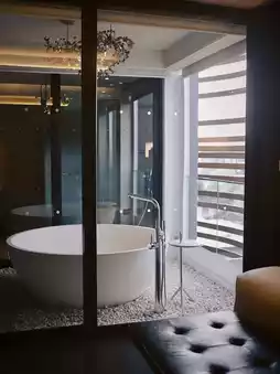 There are various room types including superior rooms and suites, with the suites' circular bathtubs facing the mountain view. Smart TVs, Bluetooth speakers, and Egyptian long-staple cotton bedding all add to the comfort of the stay.