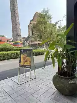 The shop is beautifully decorated, clean, has hot and cold drinks and bakery. It is suitable for sitting and taking beautiful photos. There are both indoor and outdoor areas where you can sit and enjoy the view of the temple up close. If you come to Wat Chedi Luang, we recommend you stop by.
