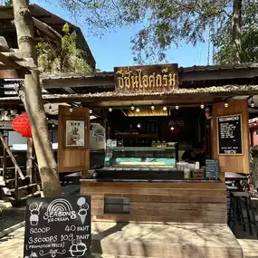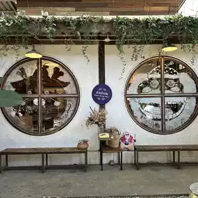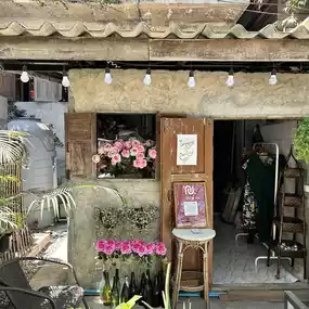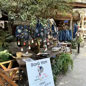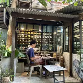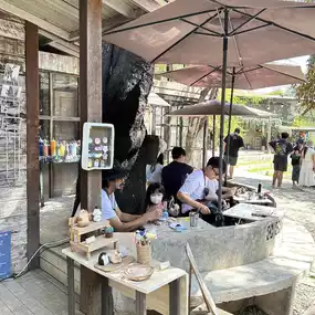 The House Next to the Temple is a very famous cafe in Chiang Mai. In the morning, I stopped by for breakfast in this area, and since the House Next to the Temple was on the way, I decided to give it a try. Inside, it's like a market with clearly defined zones. There are quite a lot of people strolling around. Those who like workshops would probably enjoy it because there are so many activities to do, such as t-shirt painting, color painting, various art works, glass making, earring making, bracelet making, glass painting. There are many more activities as I walked through, it was really a lot. And next to the House Next to the Temple, there is a sincere market with many handmade items that they have crafted themselves for sale.
