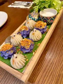 ✨The menus we tried were Cho Muang and Jib Nok, appetizers served as dumplings in the shape of purple flowers and white birds, a total of 8 pieces, served with coconut milk.