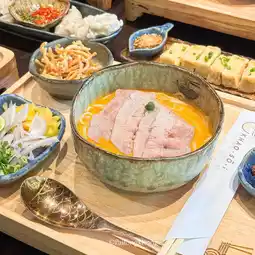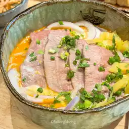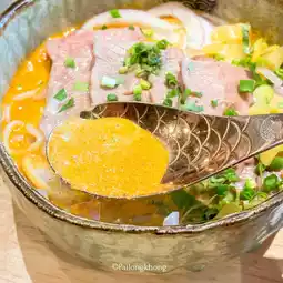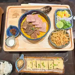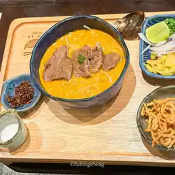 It is a fusion Khao Soi shop that is quite expensive. But when I tried it, I felt that it was really worth the price. For example, we tried the Khao Soi with beef shoulder blade, which was a little over a hundred baht. The beef looked good, not bad. The fresh noodles were chewy and soft, and the soup was thick and a little soupy. The pickled vegetables and crispy noodles were refillable. In addition to the Khao Soi, we also ordered fried tofu and wontons. It turned out that they were also delicious. The wontons had thin skin and were very filling. The sauce was delicious. The crispy tofu was delicious. I don't usually like to eat tofu, but I still think it's delicious. If you haven't tried it, I have to say that you have to try it.