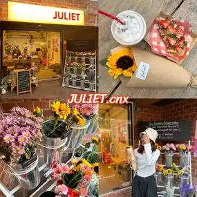A European-style cafe in the Nimmanhaemin area. The front of the shop is decorated with compact flower shelves contrasting with the red brick walls that give the feeling of a foreign flower shop. It feels like Emily in Paris. 💃🏼🌷