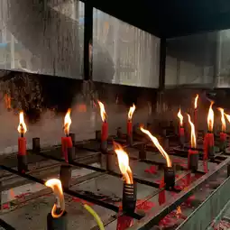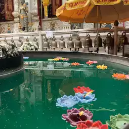 The ritual begins with making merit and paying homage to the Buddha in the chapel, where the temple provides large red candles to light outside before entering to bow to the Buddha and place flowers inside the chapel. After that, the process of worshipping the Uppakut Buddha in the Tripitaka Hall begins with ringing the entrance bell, chanting prayers, paying respects, and then ringing the exit bell. The temple provides clear instructions for these steps.
