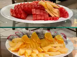 Salad, fruits, desserts, soy milk with deep-fried dough sticks, ginger syrup tofu pudding, Thai desserts