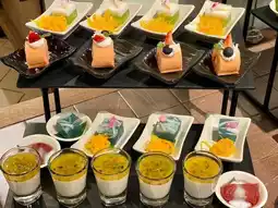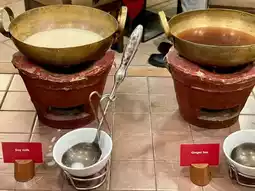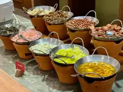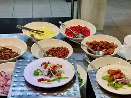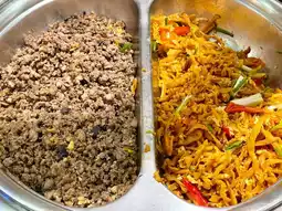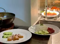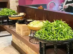 Vegetable station for fresh stir-fry, salad station, noodle station, pork leg station, roasted red pork and crispy pork station, water, tea