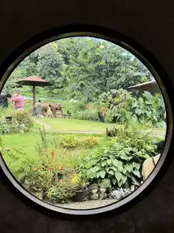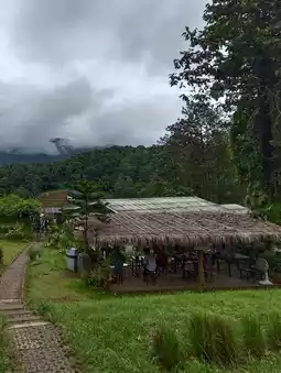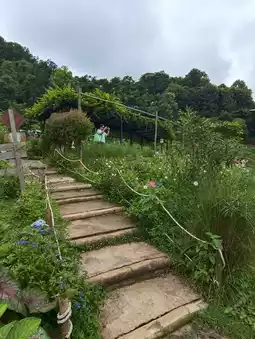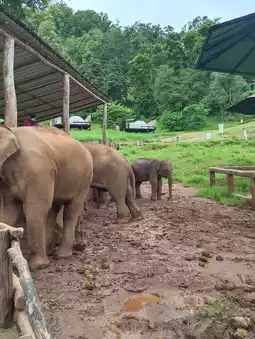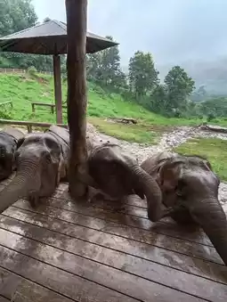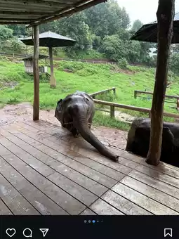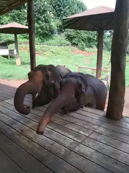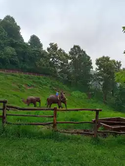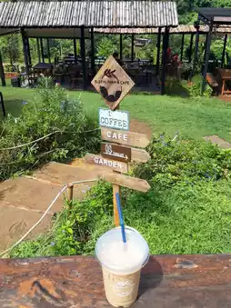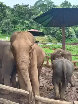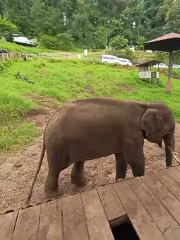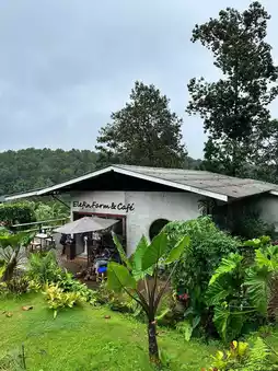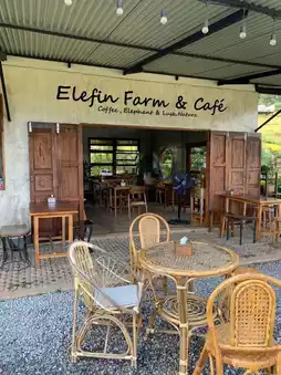 Today, we will take you to an elephant cafe that is not far from Chiang Mai. Drive along Hang Dong-Samoeng Road and you will find an elephant farm that has a coffee cafe. You can sit and sip coffee and play with the elephants on the farm. Here, they let you play, touch, take pictures, and do activities with the elephants up close. There are many beautiful photo spots, many different spots. You can also feed the elephants bananas. For those who like to do activities with elephants, such as riding elephants, they are also available. Try stopping by. I guarantee you will get up close and personal with the elephants. They are very cute. Every spot has staff taking care of them. Everyone is smiling and friendly. The atmosphere is very warm.