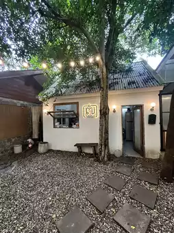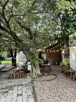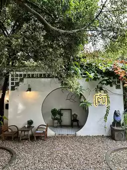 The atmosphere of the restaurant is comfortable. There is both an outdoor area where you can sit by the big trees, good atmosphere, and an indoor area that is air-conditioned.
