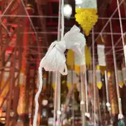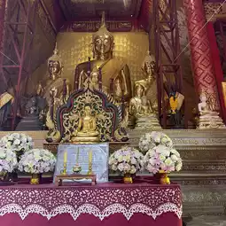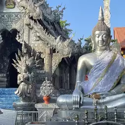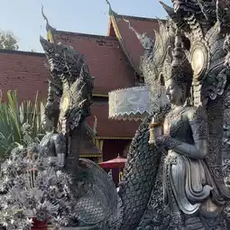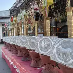 Wualai Road is considered a road that Thais and foreigners visit when they come to Chiang Mai. It is a route of Lanna craftsmen, both silverware and metalwork, a culture of handicraft sources, Buddhist art that we see along the road in the area and also inscribed with artistic impressions in the temple, communicating handicrafts through stories. Comes with exquisite beauty with the intention of those who join in the intention to connect creativity, skills and Buddhist sites like "Wat Sri Suphan", the first in the world to build a silver chapel, carved with patterns and stories of the world in a universal way, inviting to study, combining Buddhism and elegant architecture, more magnificent because we are women. This silver chapel is not allowed to enter, but walking around to see the craftsmanship through knowledge about the world and the country is fun and gives good historical knowledge. There is another chapel that can be entered by both men and women, which is equally beautiful. The principal Buddha image and the interior decoration are beautiful. We came during the preparation of the ceremony. The sacred thread is draped with a Tung Boon cloth.