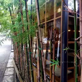 🎏 🇯🇵 The atmosphere of the shop is from the front of the shop, entering Japan. Decorated with bamboo trees, the surrounding area and the colors are in stone and wood tones, beautiful and shady, good for sitting and relaxing, very relaxing