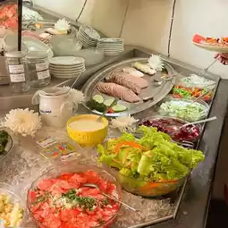 1. Cuisine: The restaurant offers a variety of cold dishes, including various cold cuts and salads. Hot dishes include German pork knuckle, meatballs, fried fish fillet, German sausage, roast chicken, chicken cordon bleu, chicken in white sauce, and more. There are also a variety of side dishes and two hot soups. In addition, there are a variety of breads, desserts, cakes, fruits, and ice cream to choose from.
