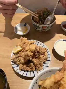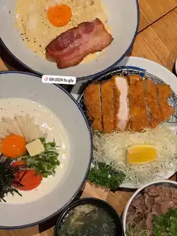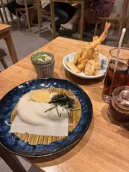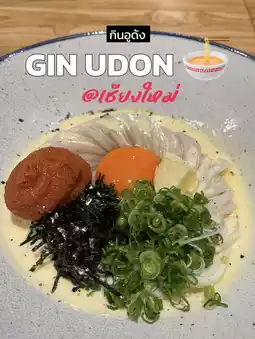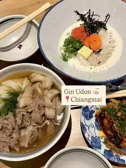 Hello, today I will review a restaurant. Today's restaurant will be a Japanese restaurant in Chiang Mai. This restaurant is called "Gin Udon". It is a fresh udon noodle restaurant that is made in front of the shop. It is located in the moat area, Chiang Mai. It is a small shop hidden in a building. It looks small, but when you enter the shop, it is not small at all. There are many tables to sit at. The recommended menu of the shop is mostly udon noodles, such as udon with mentaiko cream sauce, which is the shop's signature menu. It is creamy and rich. The homemade noodles are soft and chewy and made fresh every day. But today we chose a rice menu. We ordered fried chicken karaage, tempura shrimp, and sliced pork rice. Served with miso soup. I must say that every menu is delicious, especially the tempura shrimp that is fried hot and crispy. Eat it with Japanese rice. Each dish is not small. 2 people can eat and be very full. It is very good value for money. I recommend it.