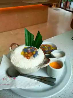 I treated myself to their signature dessert, which was beautifully presented—a soft, creamy shaved ice topped with colorful pearls, accompanied by a rich coconut sauce and sweet caramel on the side. Every bite was a perfect blend of texture and flavor, refreshing yet indulgent.