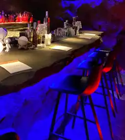 If you want to enjoy a different atmosphere in Chiang Mai, I recommend Cafe Mas! It is an impressive place with a sensual interior that feels like you are in a spaceship. The bar-style seats and rock-like tables create a unique atmosphere, and the lighting maximizes the mysterious feeling.