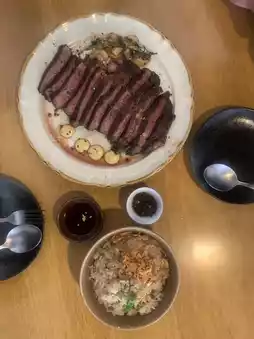 Who here loves beef? Let's head up north to Chiang Mai and visit a hidden beef restaurant located on the roadside in the Chang Klan area. The exterior of the restaurant looks ordinary, but inside it's warm and charming. We had a 300G ribeye steak, which was grilled to perfection. No wonder the place is packed! We also ordered beef fat fried rice to go with it, and it was delicious. The restaurant also offers single-dish menus like stir-fried basil beef. If you're a beef lover, you must try it!
