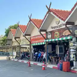 🏍️ In the front, there is a motorcycle rental shop and a car rental service.