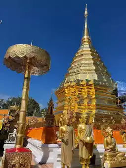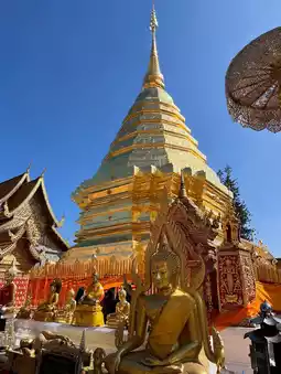 Wat Phra That Doi Suthep is a breathtaking temple perched on Doi Suthep mountain, overlooking Chiang Mai. This sacred site, which dates back to the 14th century, is famous for its stunning golden chedi that glimmers in the sunlight, creating a mesmerizing sight. The journey to the temple involves a winding road adorned with lush greenery, and upon arrival, visitors are greeted by a magnificent staircase flanked by intricately designed Naga serpents. The panoramic views of Chiang Mai from the temple are simply unforgettable, adding to the spiritual experience. Inside, the vibrant murals and the serene ambiance invite contemplation and reflection. The temple is not only a significant pilgrimage site but also a beautiful representation of Lanna culture and architecture. Overall, visiting Wat Phra That Doi Suthep is a must for anyone seeking a blend of natural beauty, spiritual serenity, and cultural richness.
