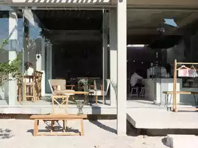 The shop is decorated in white and cement tones, with wooden furniture and large glass windows, making it airy and spacious.