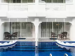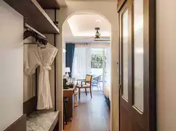 The room is spacious, has a sofa bed and a private balcony next to the swimming pool