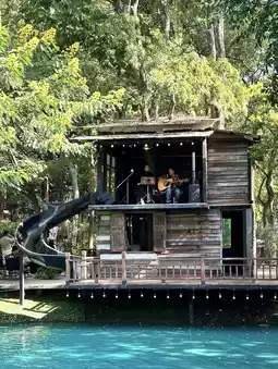 The outdoor area features a DJ booth surrounded by nature. When the sun shines, the shimmering water surface is truly stunning! Live DJ performances enhance the ambiance with excellent music.