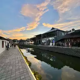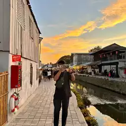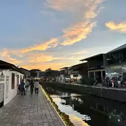 Watch the sunset reflecting on the water. The wooden bridge and walkway give a feel similar to the Kyoto riverside.