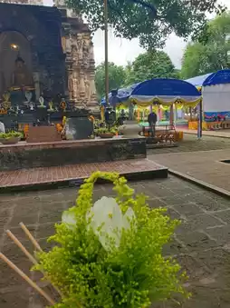 2. Offer flowers, incense, and candles to the principal Buddha image.
