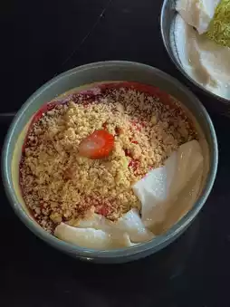 We ordered 2 cups, green tea and strawberry. Both were delicious. On top, they have soft footing, which goes great with the bingsu.