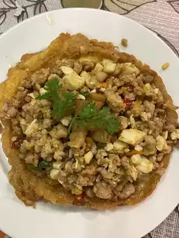 Feels like eating at Baan Mae's house. The atmosphere is warm and friendly. Today we ordered the Kai Sing menu, which is an omelet topped with minced pork stir-fried with salted eggs and pork rinds, which is a legend of this restaurant. It's really delicious. We also ordered pork bread, which is a menu that you can't miss if you come here. Plus the seafood stir-fried with curry powder, shrimp, and squid, fresh and bouncy, specially selected. Plus, the taste of the food is indescribable. And we also ordered clear soup with tofu to sip the soup, it's really good.