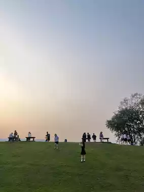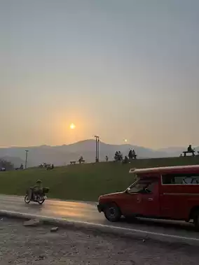 The evening is the best. The sun sets behind the mountains. The sky is so beautiful that you have to take out your phone and take a lot of pictures. Here, people come to walk, take pictures, ride bicycles, or just sit and relax with friends quietly. It's awesome. Whether you come alone, as a couple, or in a gang, it's all perfect.