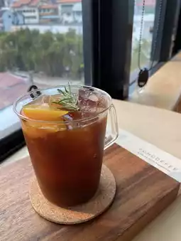 First of all, the shop is located on the 5th floor of a building. Downstairs, you will see the Manifreshto shop. You can walk up the stairs or take the elevator. The shop is decorated in Japanese style. I recommend coming in the evening to sip coffee and watch the sunset. You can see Doi Suthep and One Nimman. Sometimes, if you go there, you may also see airplanes flying by. It feels really good.🥹 Most of the shop's menus are tea, coffee, and a few snacks. The shop also has coffee beans to choose from. The signature menu uses an espresso and drip machine.