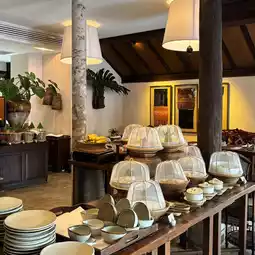 🛌 The room I stayed in was the Lanna Deluxe Room. My room was on the ground floor and had a private balcony overlooking the tamarind tree and lush greenery 🍀. The interior features dark wood materials and dim lighting, creating a cozy and inviting atmosphere. The TV is not a Smart TV, and the bathroom is equipped with a shower 🚿. The room is well-equipped with amenities, the bed is comfortable, and the breakfast buffet offers a wide variety of dishes. The dining area overlooks the pool, making for a very relaxing experience ✨.