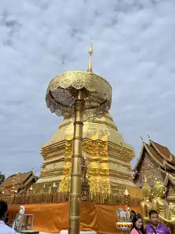 The centerpiece of the temple is its golden chedi (stupa), which shines brilliantly in the sun and houses the Buddha relic. The temple complex also features ornate shrines, bells, statues, and detailed murals that reflect traditional Lanna architecture and Buddhist symbolism.